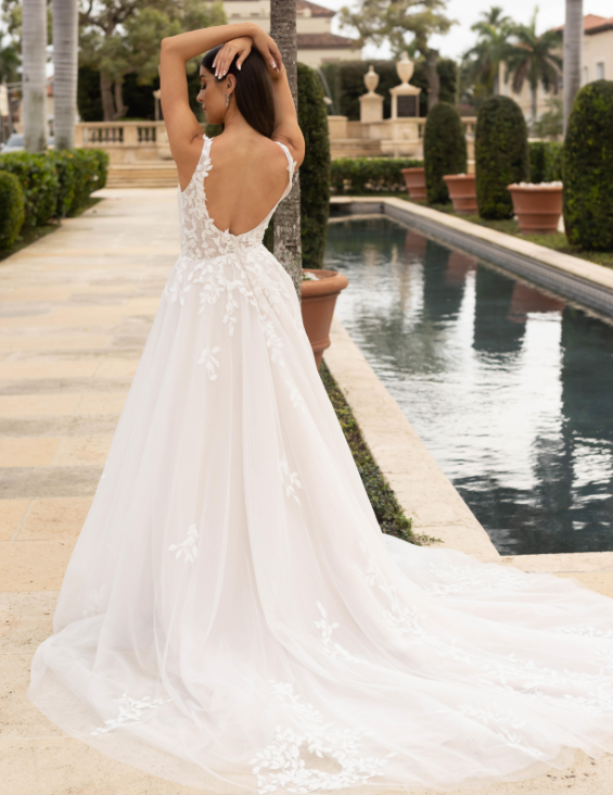 Step into timeless romance with this breath taking A-line wedding gown. Featuring a deep V-neckline, sheer bodice, and delicate 3D floral lace appliqués, this gown perfectly balances modern allure with ethereal elegance. The flowing tulle skirt with soft volume and subtle train creates dreamy movement, while the textured floral details add depth and dimension. Ideal for brides seeking a gown that is both whimsical and sophisticated