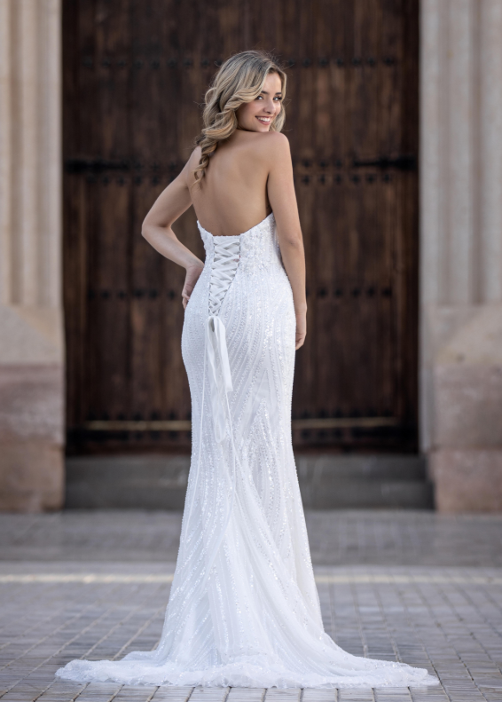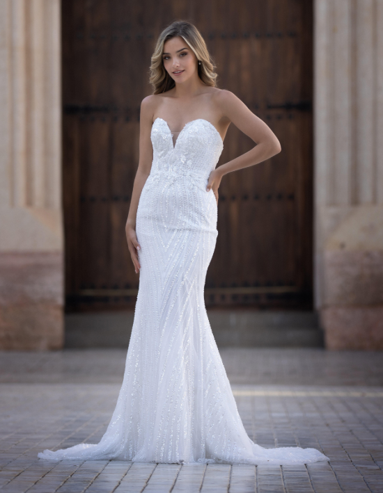 Make a statement in this glamorous fit-and-flare wedding dress designed for the modern bride who loves sophistication with sparkle. The structured strapless sweetheart neckline highlights the décolletage, while the figure-hugging silhouette accentuates every curve before flowing into a soft, sweeping train.