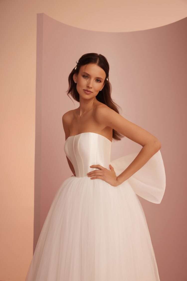 The Nadia gown (L427) is a harmonious blend of classic Mikado silk and ethereal tulle, creating a gown that is both structured and romantic. The strapless corset bodice with a sweetheart neckline offers a flattering silhouette, while the voluminous tulle skirt adds a touch of drama. A detachable oversized bow at the back provides a customisable statement, allowing brides to transform their look from ceremony to reception.