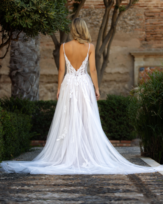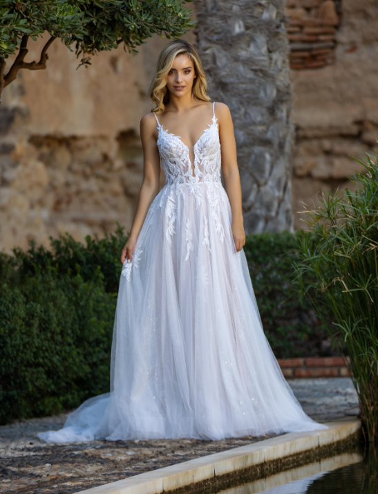 Make a graceful entrance in this A-line wedding gown designed for the modern romantic bride. Featuring delicate spaghetti straps and a plunging V-neckline with illusion detailing, this gown highlights the figure while offering a soft, airy flow. The sheer bodice is adorned with lace appliqués that cascade down into a lightweight, layered tulle skirt, creating a look that is both elegant and effortlessly dreamy.